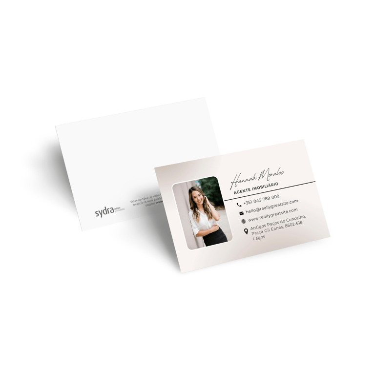 Com um design elegante na frente e o nosso logotipo da Sydra no verso, estes cartões não só elevam a sua marca como também lhe dão a oportunidade de conhecer um produto da Sydra Gráfica Online.