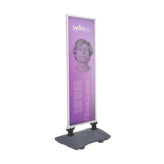 Este mupi publicitário é composto por dois factores principais: a estrutura e a base em tanque. A estrutura, livre de arestas, possui molas de aço para maior flexibilidade, assegurando a resistência contra ventos e impactos. A base tanque, com rodas incorporadas, pode ser enchida até 24 litros, proporcionando estabilidade sem comprometer a mobilidade. Com este recurso, pode transportar facilmente este expositor promocional de um lugar para o outro, tornando-o perfeito para eventos a decorrer ao ar livre, feiras e congressos.